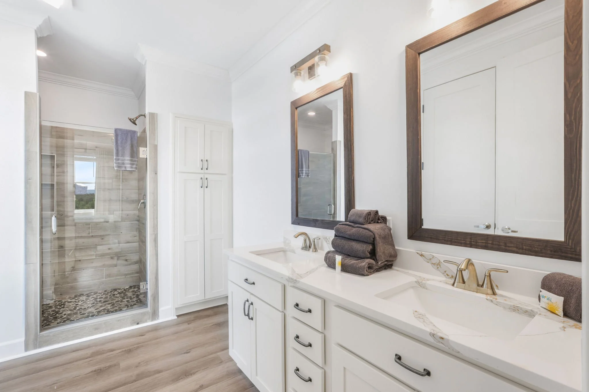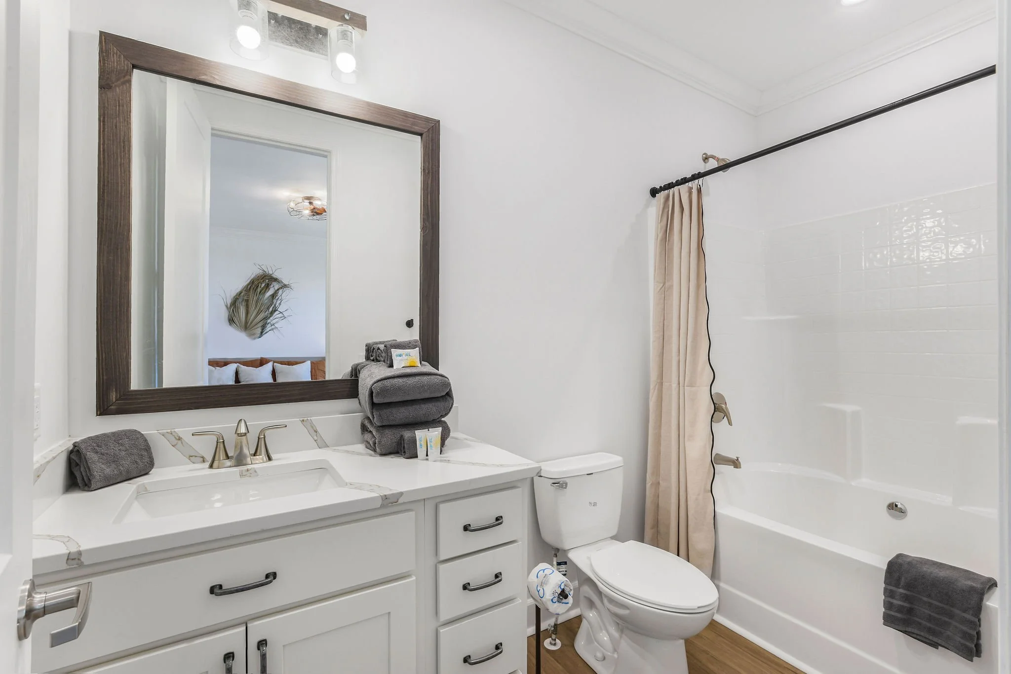 All bathrooms are stocked with soft towels, bath products, and plenty of storage.