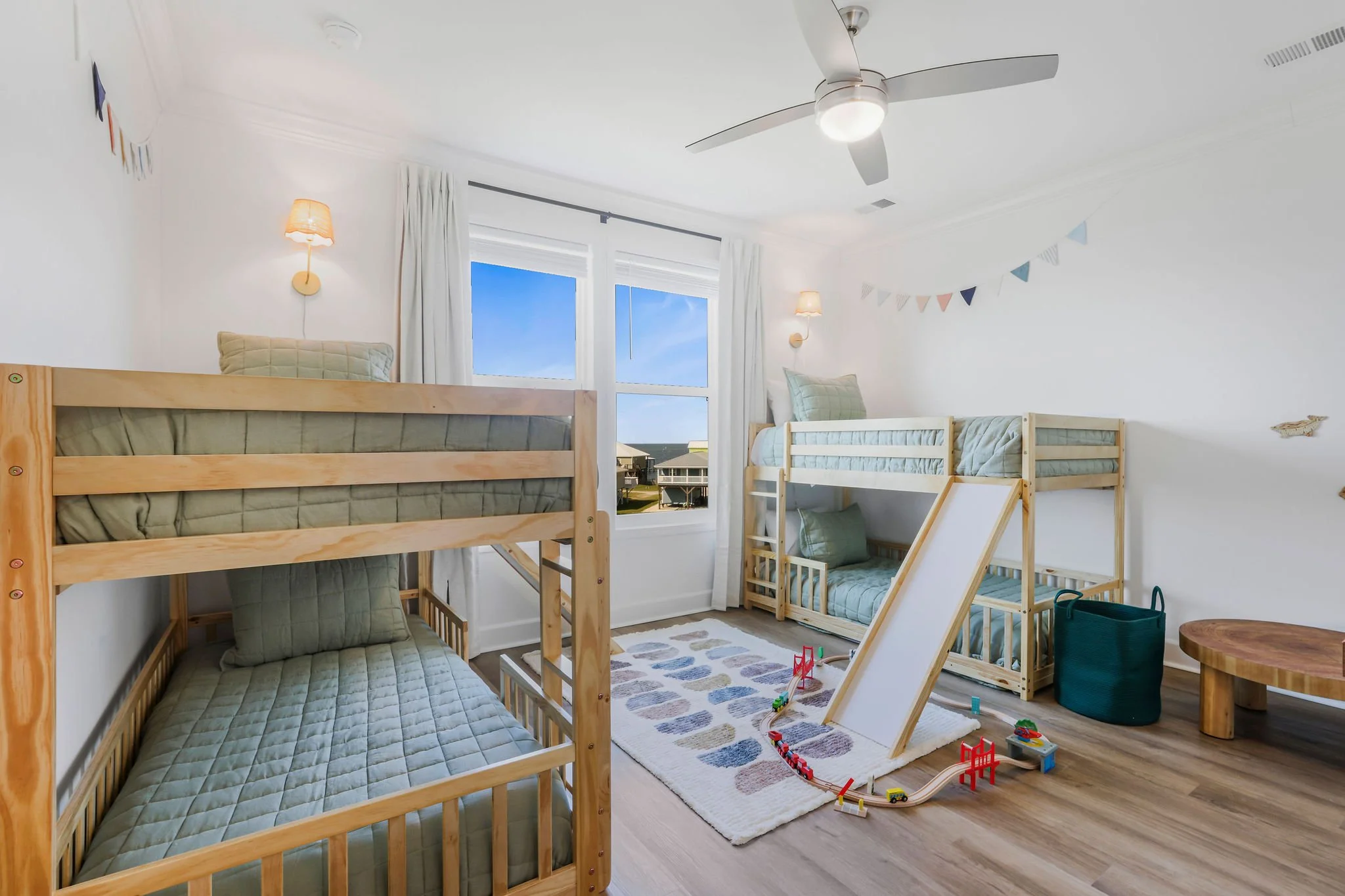 Bunk Room – A kid's paradise with sweeping bay views! Two bunks sleep 4. Slides, wooden train sets, and plenty of place to play make this room double as a playroom! Close to bathroom with a tub, perfect for little ones.